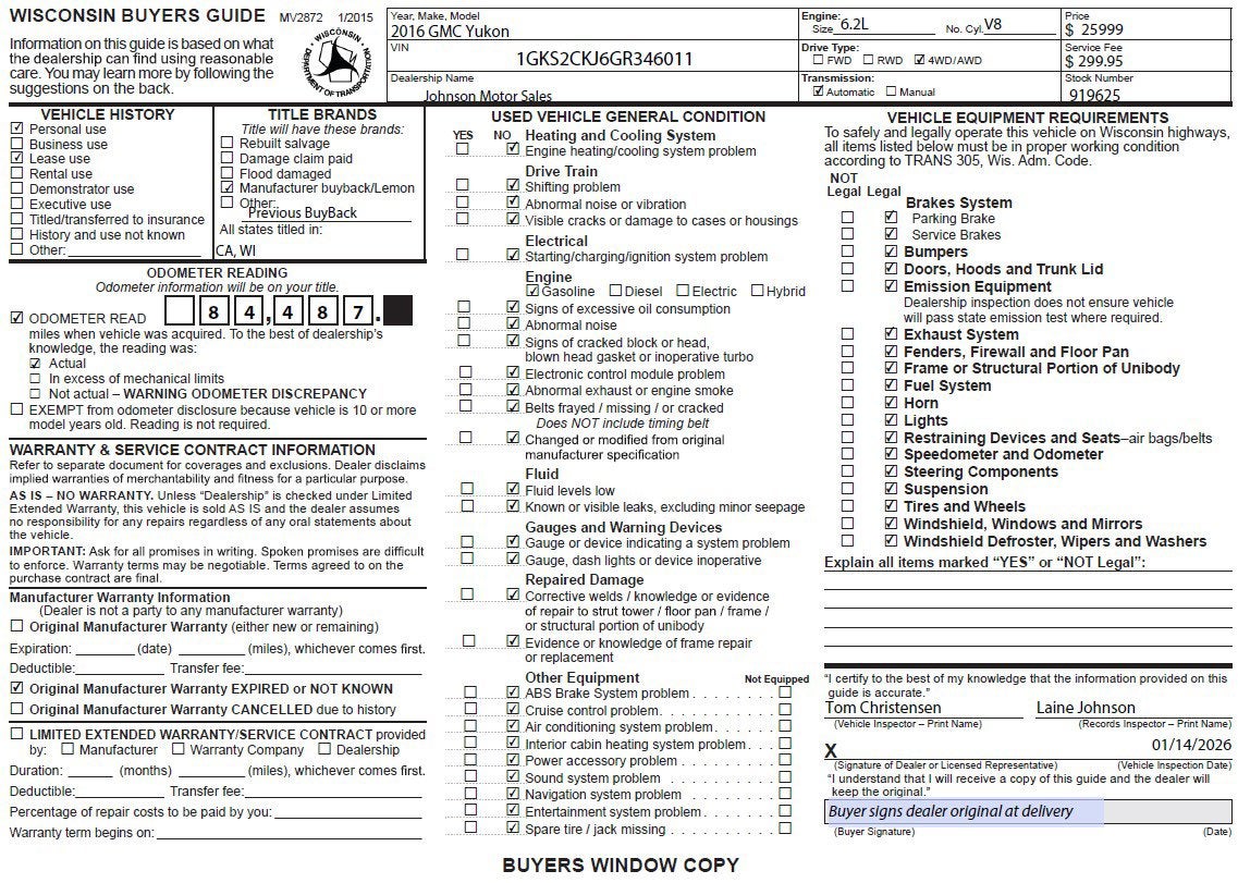 KBB.com Brand Image Awards. Only 84,487 Miles! Scores 21 Highway MPG and 15 City MPG! This GMC Yukon delivers a 6.2L V8 engine powering this Automatic transmission. WHEELS, 22 X 8.5 (55.9 CM X 21.6 CM) ALUMINUM WITH CHROME INSERTS, TRANSMISSION, 8-SPEED AUTOMATIC (STD), TIRES, P285/45R22, ALL SEASON, BLACKWALL.