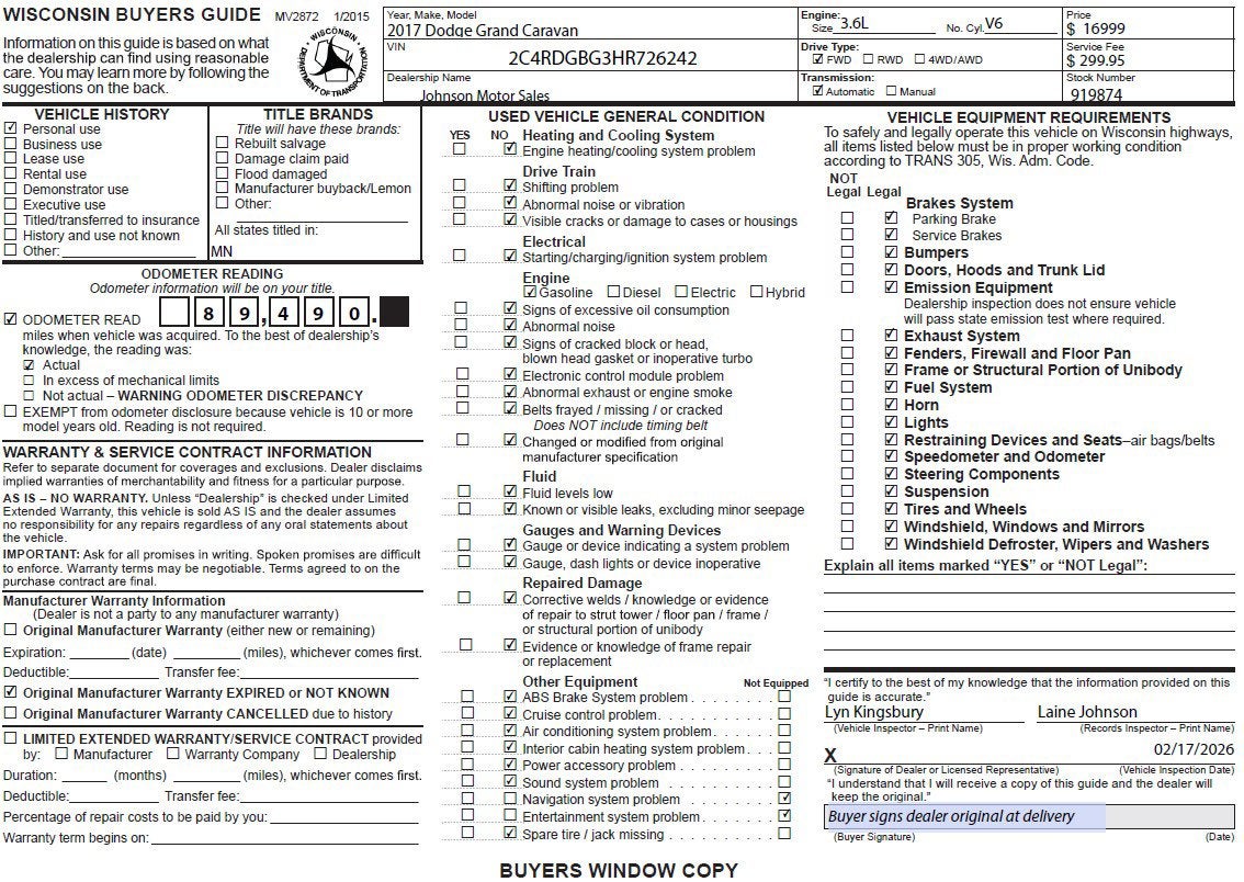 Boasts 25 Highway MPG and 17 City MPG! This Dodge Grand Caravan delivers a 3.6L V6 engine powering this Automatic transmission. WHEELS: 17 X 6.5 STEEL (STD), TRANSMISSION: 6-SPEED AUTOMATIC 62TE (STD), RADIO: 430 -inc: ParkView Rear Back-Up Camera, 6.5 Touchscreen Display, Audio Jack Input for Mobile Devices, 40GB Hard Drive w/28GB Available, 6 Speakers.