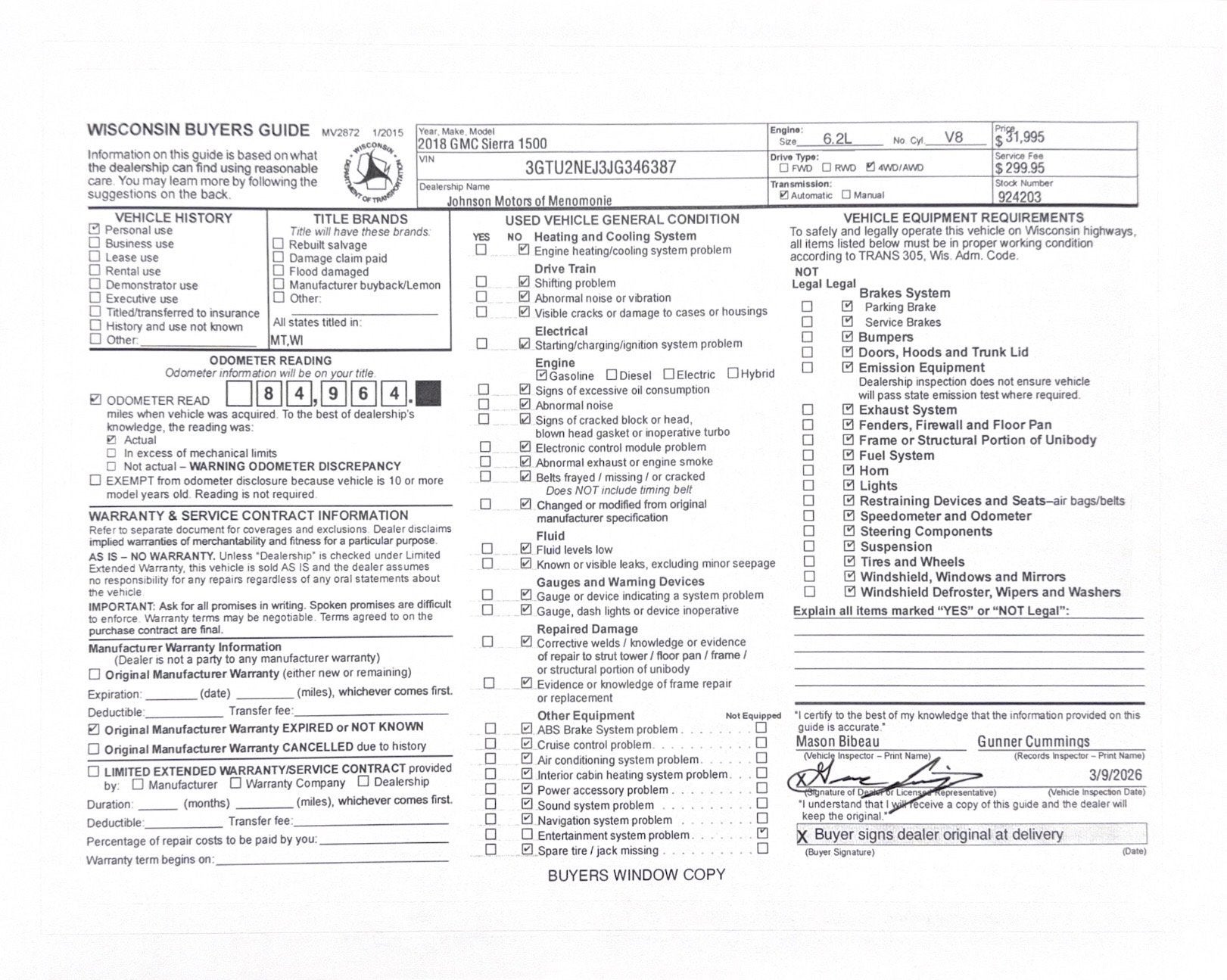 6.2L V8, 4X4, Bose Premium Audio, Z71 Offroad, Heated Wheel, Heated & Cooled Leather.Local 1-owner Trade!Price does not include sales tax, title, registration, or $299.95 service fee.Only 84,964 Miles! Delivers 20 Highway MPG and 15 City MPG! This GMC Sierra 1500 delivers a 6.2L V8 engine powering this Automatic transmission. WIRELESS CHARGING, WINDOW, POWER, REAR SLIDING WITH REAR DEFOGGER, WHEELS, 20 X 9 (50.8 CM X 22.9 CM) CHROME CLAD ALUMINUM.*This GMC Sierra 1500 Comes Equipped with These Options *SUSPENSION PACKAGE, OFF-ROAD includes Z71 chrome side front fender emblems, monotube Rancho brand shocks and (K47) air cleaner, (JHD) Hill Descent Control, (NZZ) underbody shield, SLT CREW CAB PREMIUM PLUS PACKAGE Includes (NZP) 20 chrome clad wheels, (QSS) P275/55R20 all-season, blackwall tires, (UD5) Front and Rear Park Assist, (UVD) heated steering wheel, (A48) power sliding rear window, (BVQ) 6 rectangular chrome tubular assist steps, (UQA) Bose premium audio system, (IO6) GMC Infotainment 8 Diagonal Color Touch audio system with Navigation, (JL1) trailer brake controller, (Y86) Enhanced Driver Alert Package, (AN3) front bucket seats, (KQV) heated and vented seating, (CGN) spray-on bed liner and (T4L) full LED headlamps., ENHANCED DRIVER ALERT PACKAGE includes (UHX) Lane Keep Assist, (TQ5) IntelliBeam headlamps, (UHY) Low Speed Collision Mitigation Braking, (UD5) Front and Rear Park Assist and (UEU) Forward Collision Alert, Safety Alert Seat , UNDERBODY SHIELD, TRANSFER CASE PROTECTION, TRANSMISSION, 8-SPEED AUTOMATIC, ELECTRONICALLY CONTROLLED with overdrive and tow/haul mode. Includes Cruise Grade Braking and Powertrain Grade Braking, TRAILER BRAKE CONTROLLER, INTEGRATED, TIRES, P275/55R20 ALL-TERRAIN, BLACKWALL, STEERING WHEEL, HEATED, LEATHER WRAPPED with audio and cruise controls, SLT PREFERRED EQUIPMENT GROUP, SEATS, FRONT FULL-FEATURE LEATHER-APPOINTED BUCKET with (KA1) heated seat cushions and seat backs. Includes 10-way power driver and front passenger seat adjusters, including 2-way power lumbar control, 2-position driver memory, adjustable head restraints, (D07) floor console and storage pockets. (Includes (K4C) wireless charging..*Stop By Today *For a must-own GMC Sierra 1500 come see us at Johnson Motors of Menomonie, 1603 Hwy 12, Menomonie, WI 54751. Just minutes away!