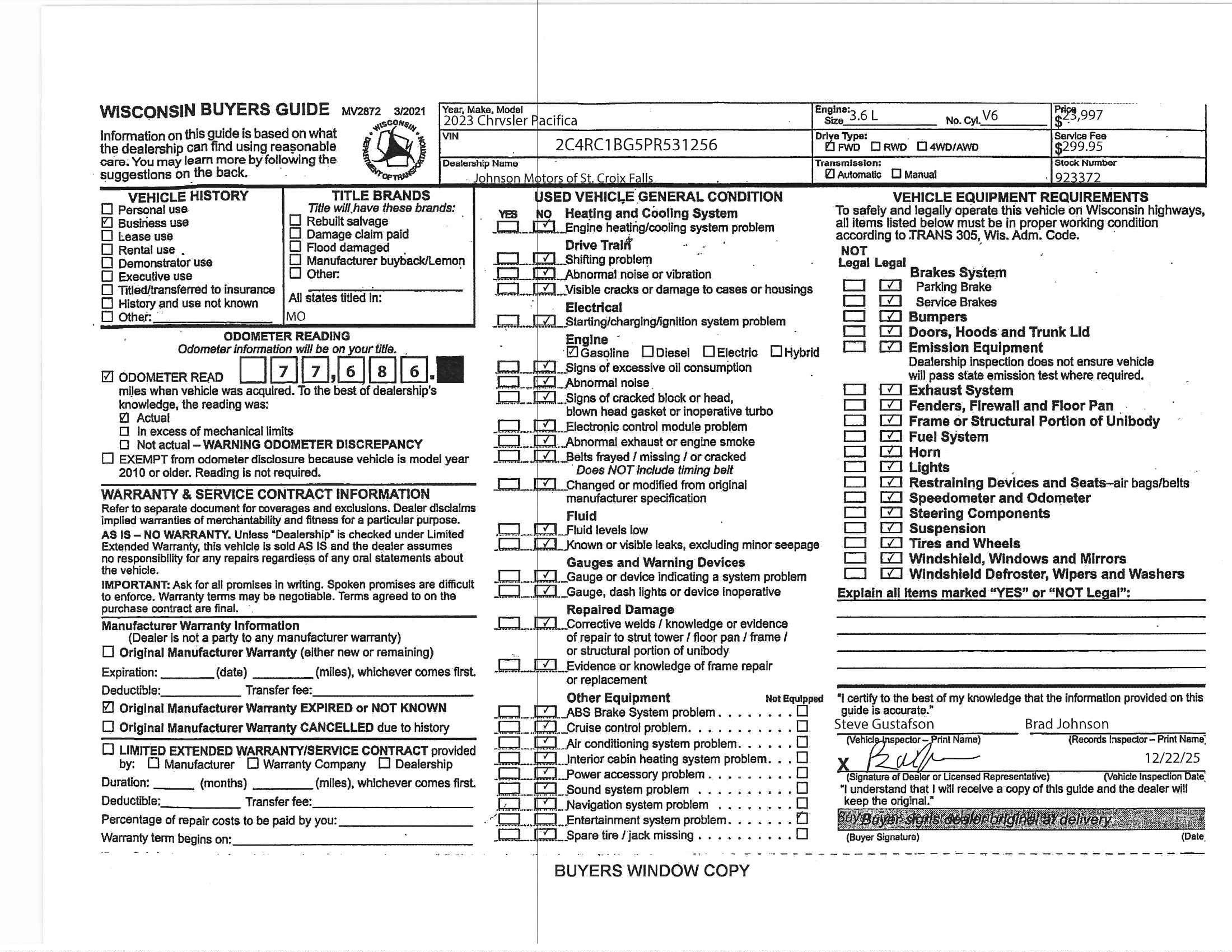 ===== 2023 Chrysler Pacifica Touring L =====*Johnson Motors of St. Croix Falls --- Celebrating 100 Years in Business*Here's a premium, family-friendly minivan that delivers comfort, versatility, and modern tech --- the *Used 2023 Chrysler Pacifica Touring L*. With thoughtful features, spacious seating, and a reputation for reliability, this Pacifica is ideal for families, carpools, road trips, and everyday errands.==== Key Features & Highlights ==== * *Spacious 3-Row Seating* Comfortable seating for up to *7 passengers*, with plenty of room for kids, friends, or cargo --- perfect for family life or group travel. * *Comfort-Oriented Touring L Trim* The Touring L adds convenient and upscale features over base trims, including premium cloth seating, power-adjustable front seats, and comfort upgrades throughout the cabin. * *Smooth, Responsive Performance* Powered by a capable V6 engine paired with a smooth automatic transmission that delivers confident acceleration with a refined ride. * *Modern Infotainment & Connectivity* An intuitive touchscreen system with Apple CarPlay® and Android Auto? keeps you connected and entertained on every drive. * *Stow 'n Go® Seating & Flexible Cargo Space* Second- and third-row seats fold flat into the floor, giving you massive cargo space when you need it --- ideal for gear, luggage, or large items. * *Driver-Assist & Safety Features* Advanced safety features like blind-spot monitoring, rear-cross-traffic alert, and available adaptive cruise control help give peace of mind on the road.==== Why It's a Smart Choice ==== * *Family-Ready Versatility:* Spacious interior and flexible seating make it great for families of all sizes. * *Comfort & Convenience:* Touring L brings upgraded features typically found on luxury vans without the premium price tag. * *Practical & Adaptable:* Easy-to-use Stow 'n Go® seating and cargo flexibility adapt to errands, trips, and everyday tasks. * *Backed by Dealer Legacy:* Johnson Motors' 100-year history means you're supported by decades of community service and trusted automotive care.*Visit Johnson Motors of St. Croix Falls today* to see this *2023 Chrysler Pacifica Touring L* in person. Our team will walk you through its features, take you on a test drive, and help you decide if it's the right fit for your lifestyle and needs.