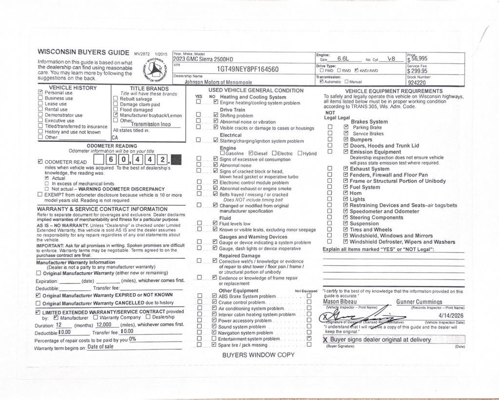 Price does not include sales tax, title, registration, or $299.95 service fee.